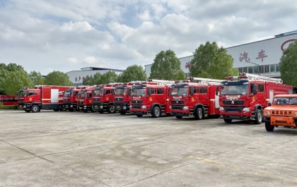 消防車現(xiàn)車停放在停車場(chǎng),每輛消防車經(jīng)過嚴(yán)格的測(cè)試,保障消防車的品質(zhì)。